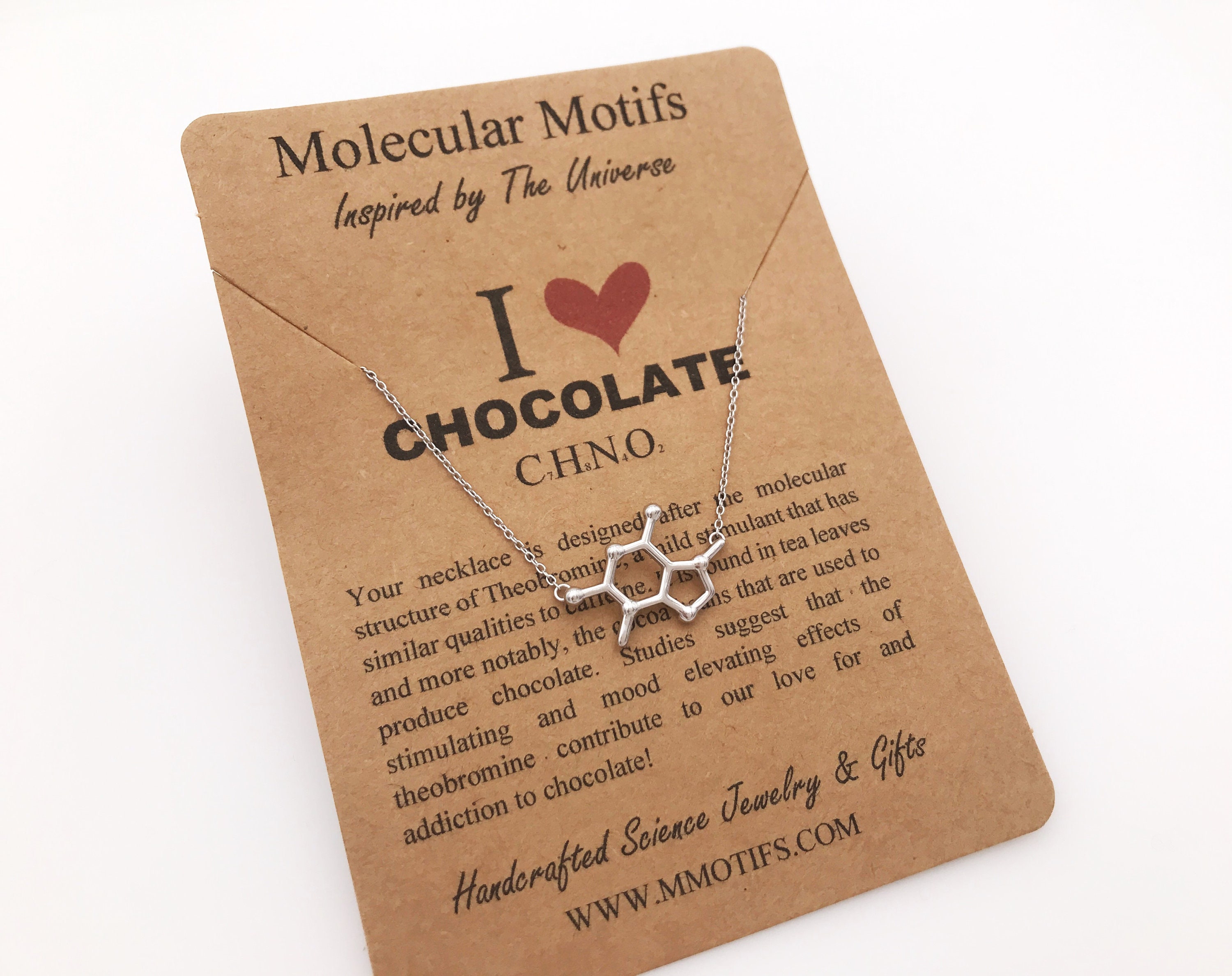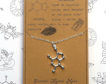 The necklace comes with a description card about serotonin making them a thoughtful gift to treasure. Theobromine is also found in tea leaves and in the guarana plant but mostly in dark chocolate and also milk chocolate. Theobromine Chocolate Molecule Necklace.